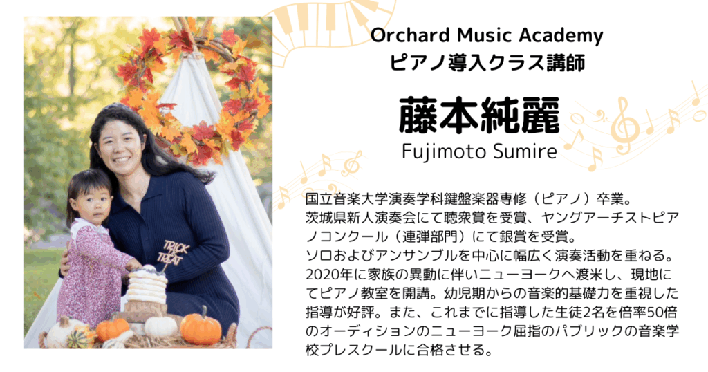 そしてこの度、ニューヨークの幼児音楽教育界でご活躍されていた素敵なピアノの先生とのご縁をいただ気、 新プログラム“ピアノ導入クラス”が誕生いたしました!ぜひ新しいOMAの講師をご紹介させてください。